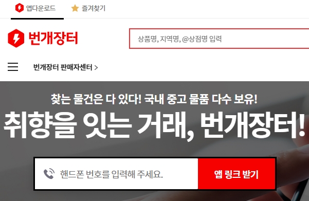 먼저 인터넷 검색을 활용하여 위의 그림과 같이 키워드를 입력 후 검색하시면 해당 홈페이지 바로가기 링크를 통할 수 있습니다. 메인화면 상단에서는 방문택배와 편의점택배를 모바일로 한방에 이용할 수 있는 번개장터 앱을 소개하고 있네요.