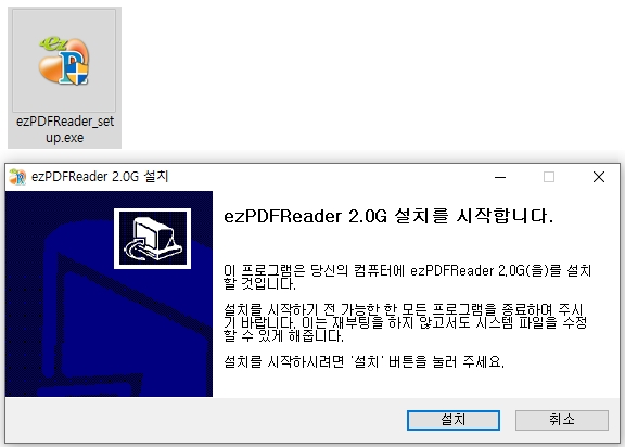 셋업 아이콘을 더블클릭하여 ezpdf reader 2.0g 설치를 시작할 수 있습니다. 인스톨 작업을 진행하기 전에 가능하면 현재 실행중인 다른 프로그램들을 종료해주시기 바랍니다. 이는 재부팅을 하지 않아도 시스템 파일을 수정할 수 있도록 해줍니다. [설치] 버튼을 눌러서 작업을 완료해줍니다.