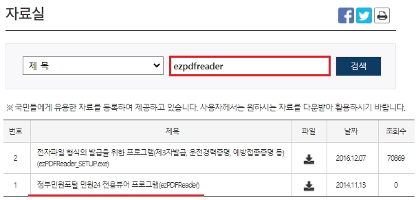 검색기준을 제목으로 설정하고, 키워드는 ezpdfreader 정도로 잡아주시면 총 2개의 결과를 확인할 수 있습니다. 1번에 있는 정부민원포털