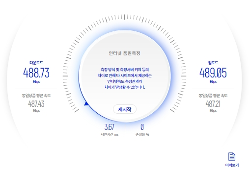 저는 SK브로드밴드의 Giga인터넷라이트 상품을 강원도 지역에서 측정해보았습니다. 다운로드 속도는 488.73Mbps, 업로드 속도는 489.05Mbps, 지연시간은 3.67ms, 손실률은 0%가 나왔습니다. 동일상품 평균속도와도 비교해볼 수 있고, 이력확인도 가능합니다. 다만 측정방식 및 측정서버위치 등의 차이로 인하여 타 사이트에서 제공하는 인터넷 속도측정 결과와 차이가 발생할 수 있다고 합니다.