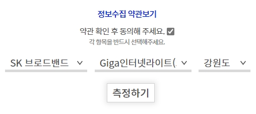 수집된 정보는 공공기관의 개인정보 보호에 관한 법률 및 공공기관의 개인정보 보호를 위한 기본지침에 따라 타 용도로는 사용되지 않습니다. 통신사, 인터넷상품, 지역을 선택하고 [측정하기] 버튼을 눌러서 측정을 진행할 수 있습니다.