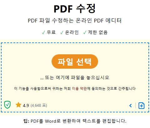 [파일 선택] 버튼을 눌러서 컴퓨터에 저장되어 있는 피디에프 문서를 불러오기 하거나, 점선 테두리영역 안에다가 파일을 끌어다가 놓습니다.