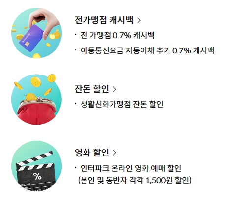 전월 이용금액에 관계없이 전 가맹점 결제금액의 0.7% 캐시백이 제공되고, 이동통신요금 자동이체 건은 추가 0.7% 캐시백이 제공됩니다.