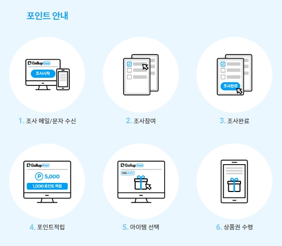 갤럽이 진행하는 조사에 끝까지 응답하신 패널에게 감사의 의미로 리워드를 드립니다. 이용 절차는 조사 참여 > 리워드 적립 > 리워드 교환 > 리워드 사용 순입니다.